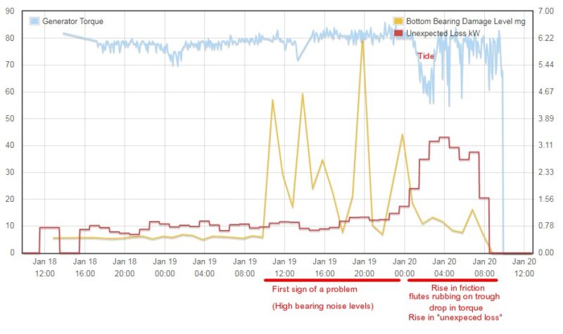 The monitoring system showed at 10am on the 19th the vibration from the bottom bearing rose significantly followed by higher than expected losses and dips in the generator torque about 14 hours later.